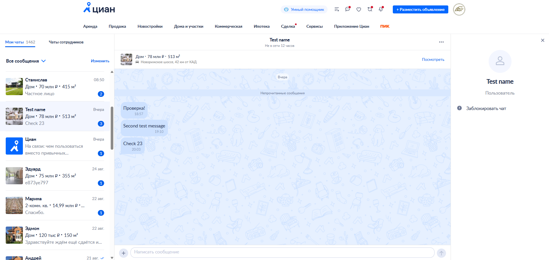 - Сообщение от клиента. Когда клиент пишет в Циан, в Chat2Desk создается карточка с его именем, аватаром и ссылкой на объявление.