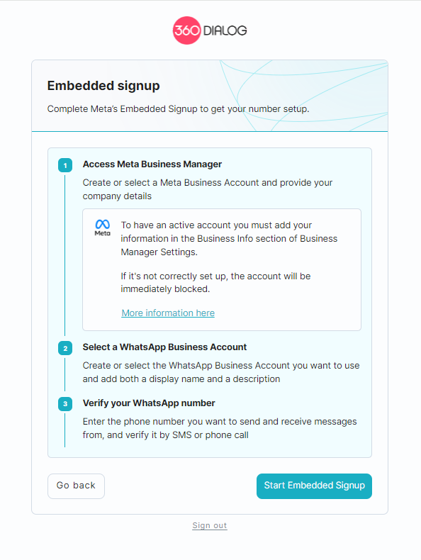 Для продолжения подключения, зайдите в персональный аккаунт Facebook*, являющийся администратором в Business Manager. После авторизации нажмите Start Embedded Signup.