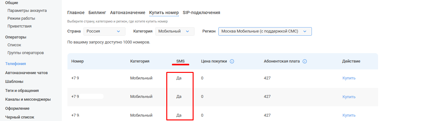 - Выберите страну Россия, категорию Мобильный, регион Москва Мобильные (с поддержкой СМС). Пока номера с поддержкой СМС доступны только в этом регионе.