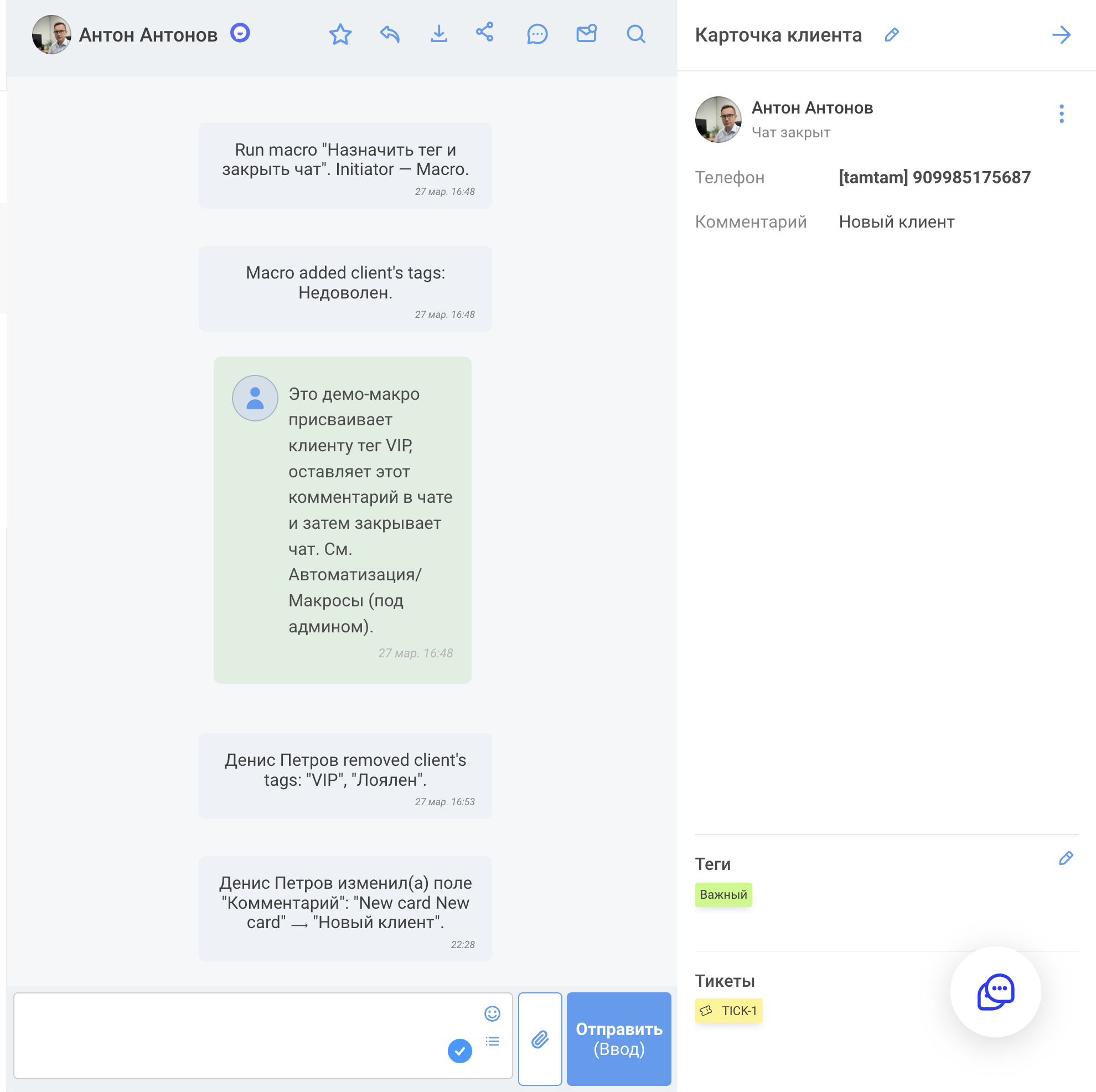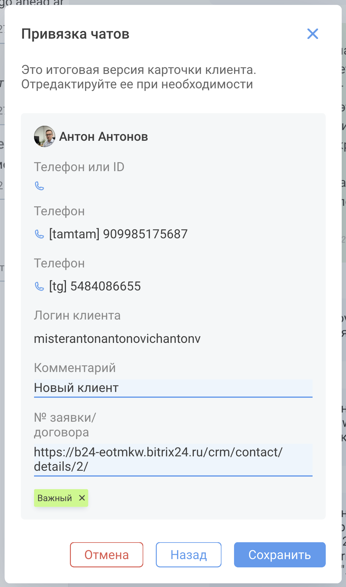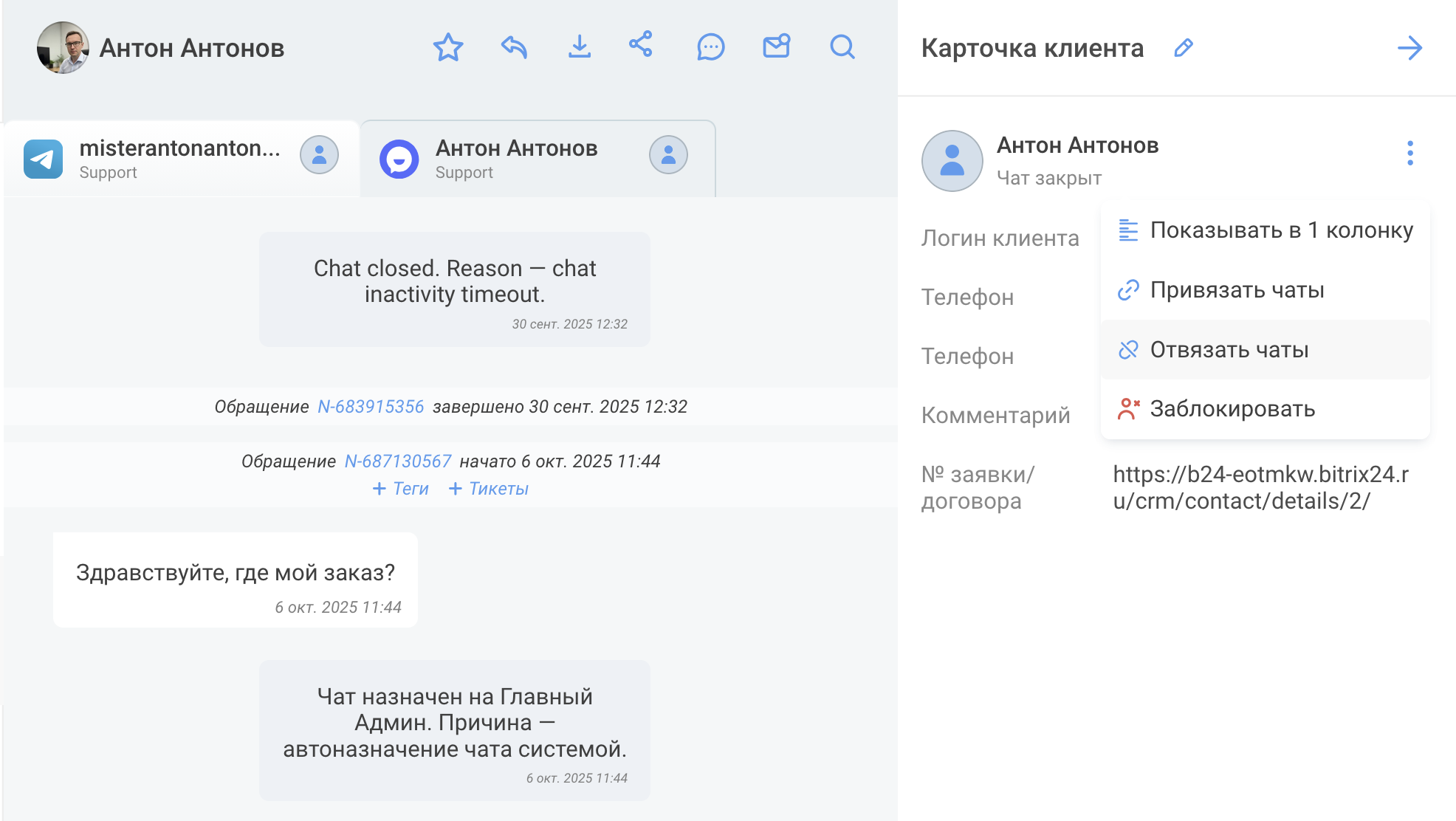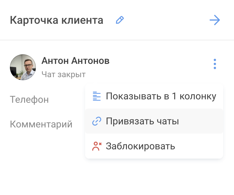 - Откройте карточку клиента через значок Развернуть карточку в правом верхнем углу чата.