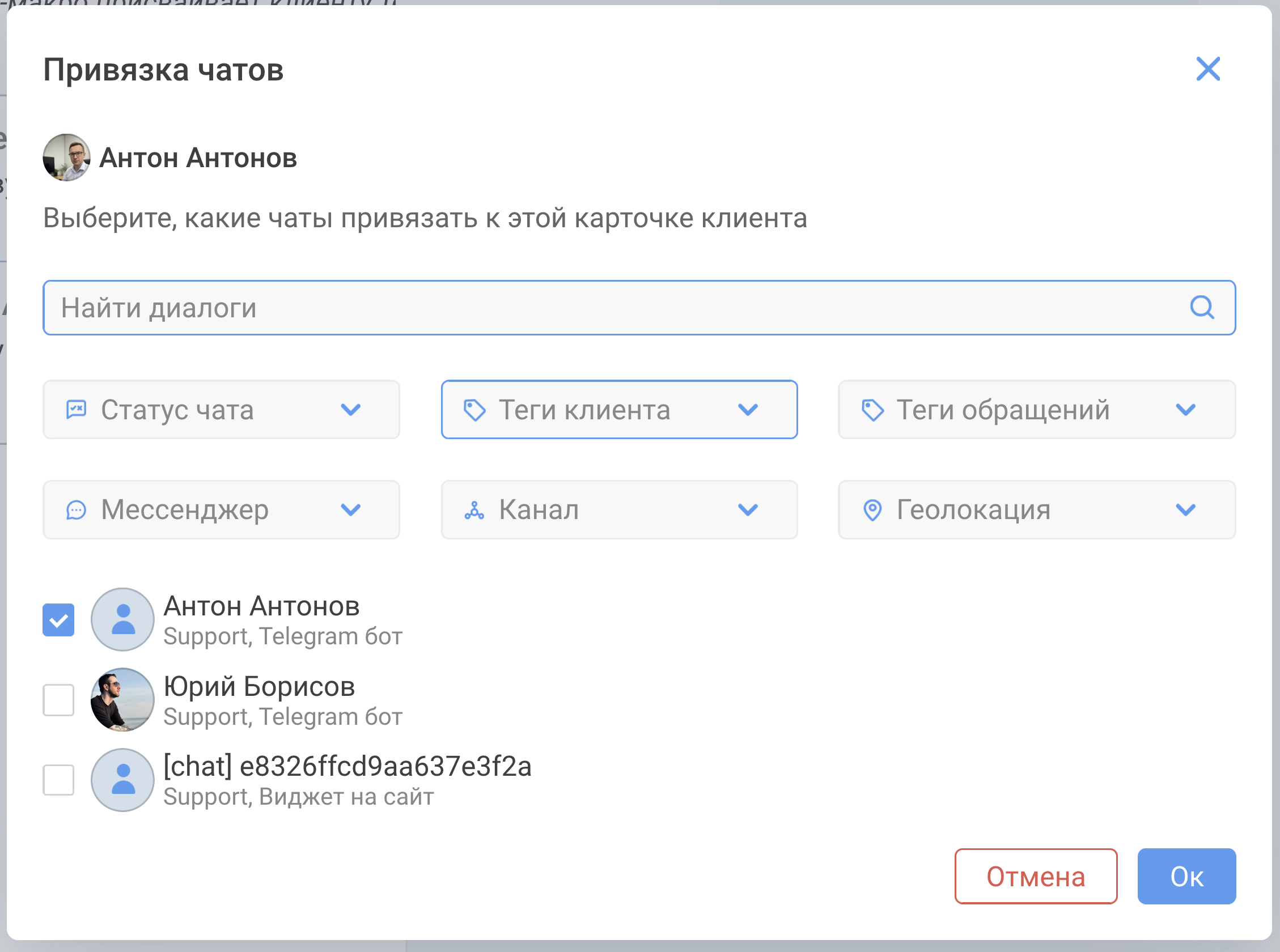 - Найдите нужные диалоги через поиск. Доступны фильтры: имя, номер телефона, dialog_id, статус чата, теги, мессенджер, канал, геолокация. Выберите диалоги и нажмите Ок.