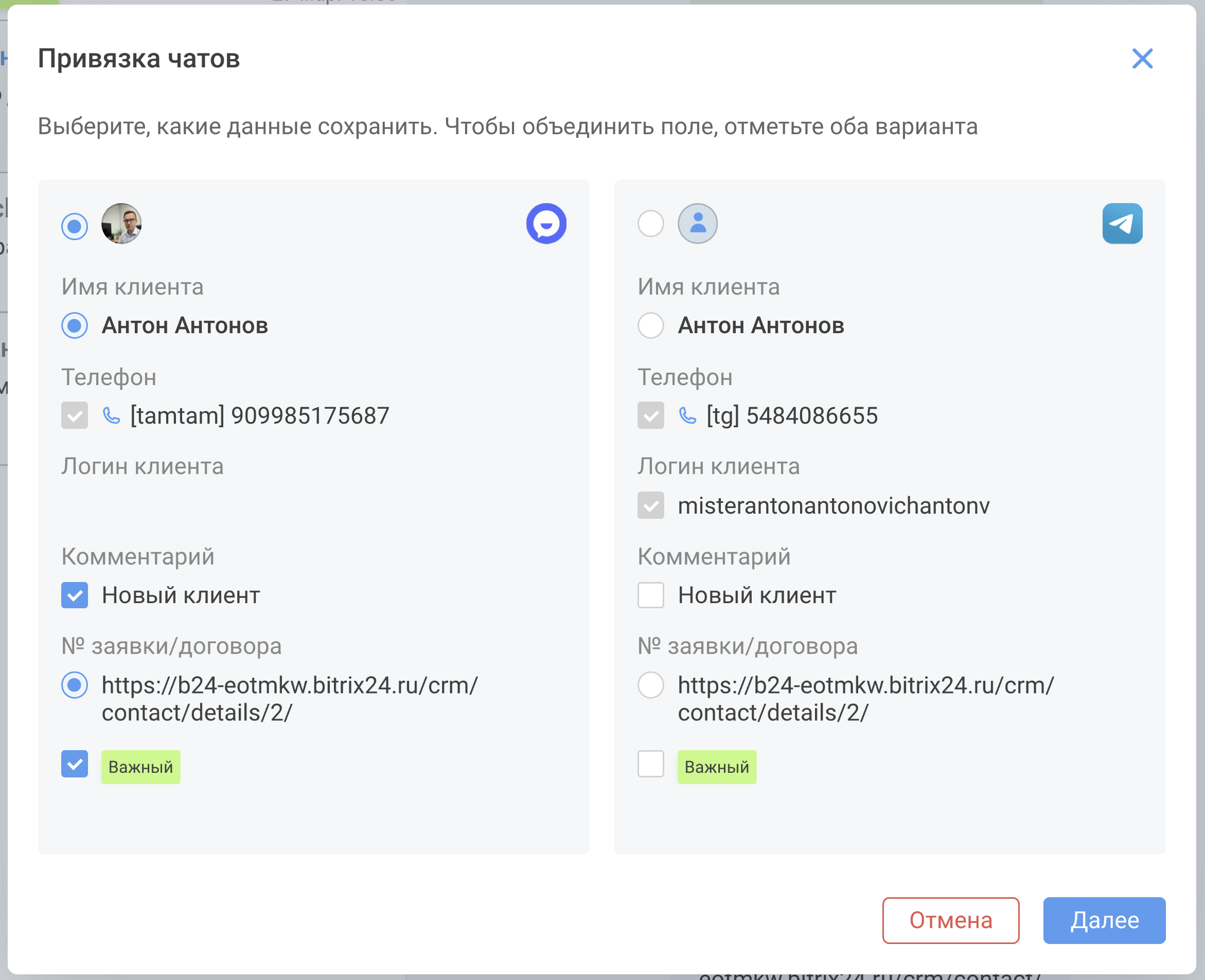 - Укажите, какие данные сохранить в итоговой карточке. Если поле допускает объединение, можно выбрать оба варианта сразу.