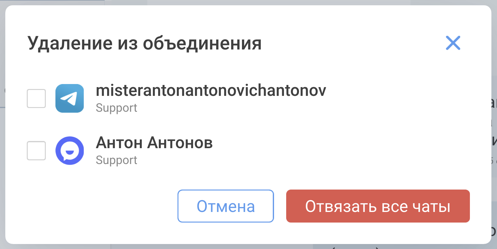 - Отметьте чат, который нужно удалить из объединения.