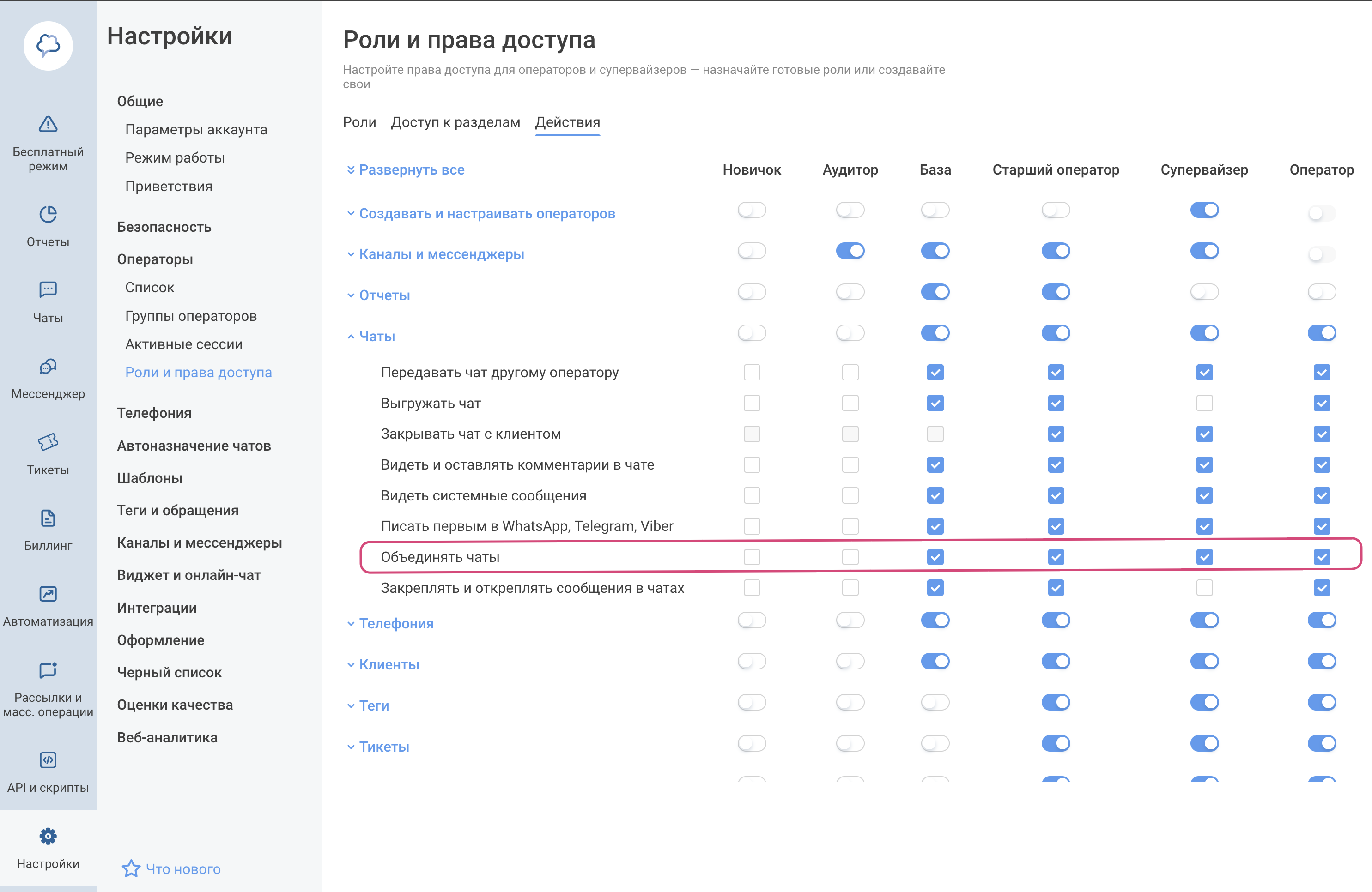 Доступ к объединению и разъединению чатов настраивается в разделе Операторы > Роли и права доступа > Действия > Чаты > Объединять чаты.