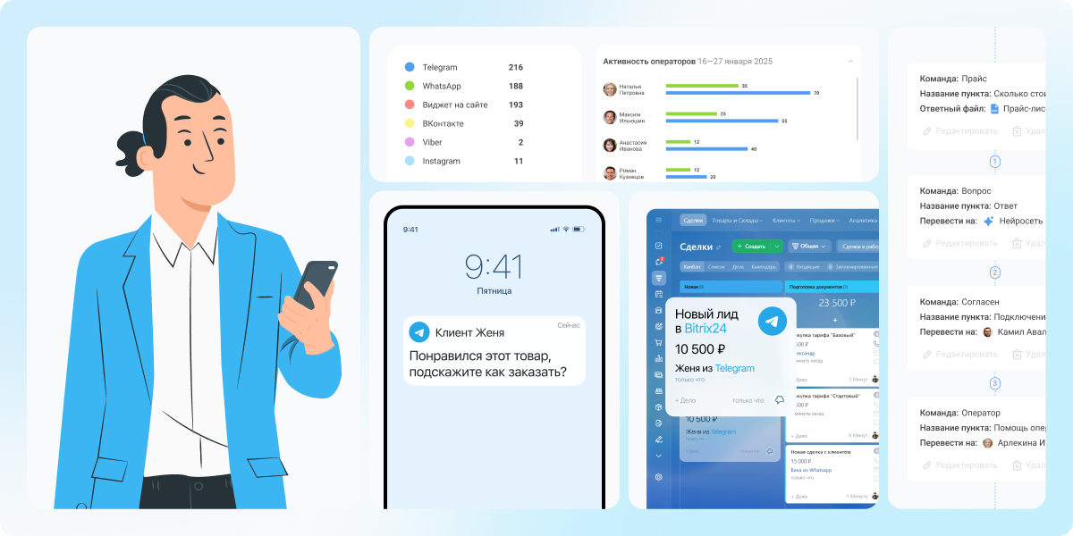 Это значит, что компания решает проблему «как отвечать на телеграм из битрикс» и вместе с тем получает полноценную систему управления коммуникациями и автоматизирует часть задач.