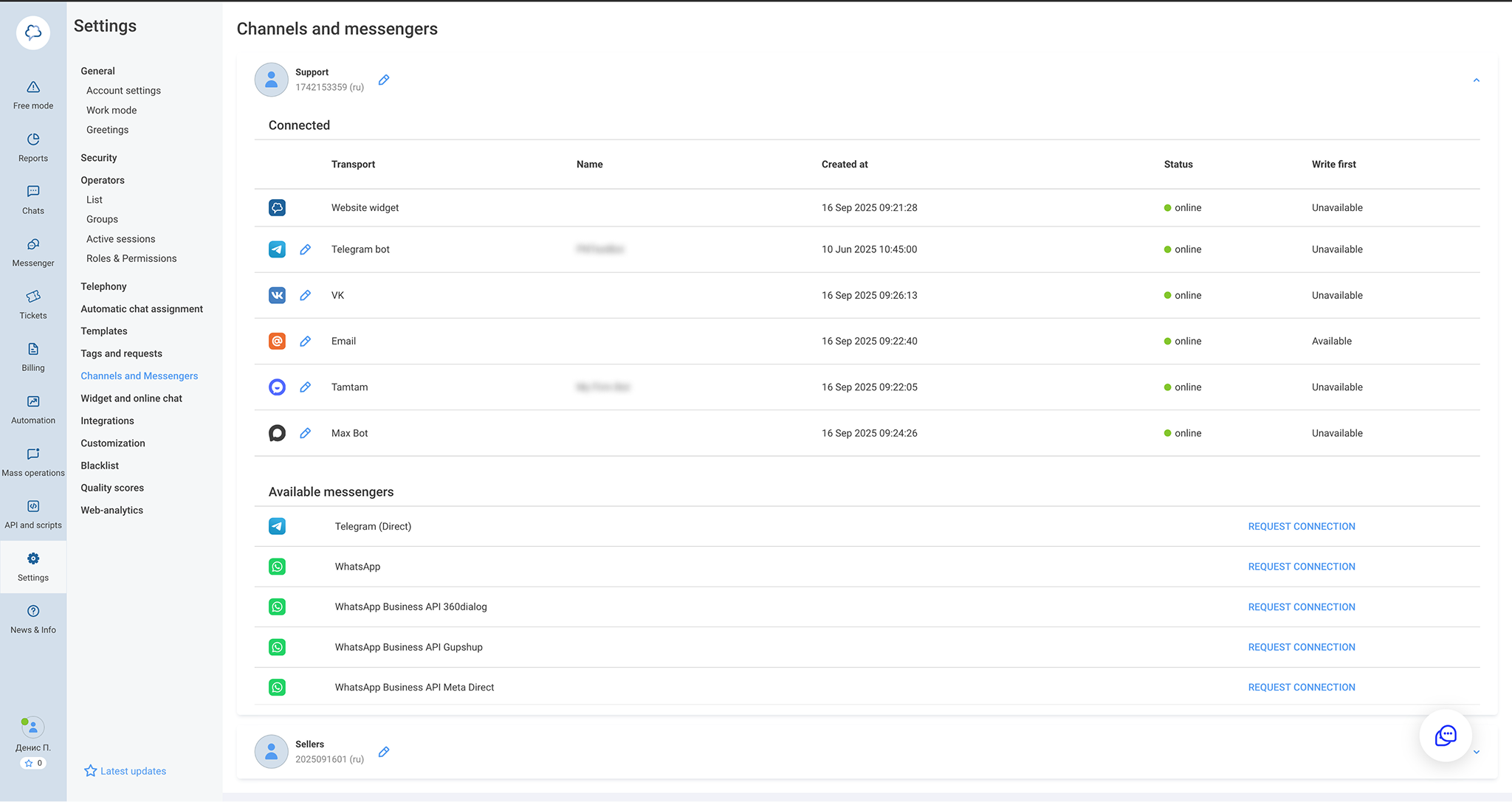Messengers and Channels section now lets you connect popular messengers on your own. If a channel supports self-service connection, Connect button appears next to it, and the setup is completed directly in the interface without waiting for support.