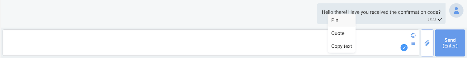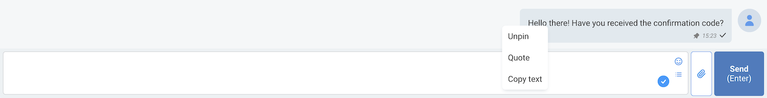 Two new actions are available in the message context menu: Pin and Unpin. Pinned messages are shown in a separate list at the top of the chat. This list is shared across all operators, so every pinned message is visible to the whole team.