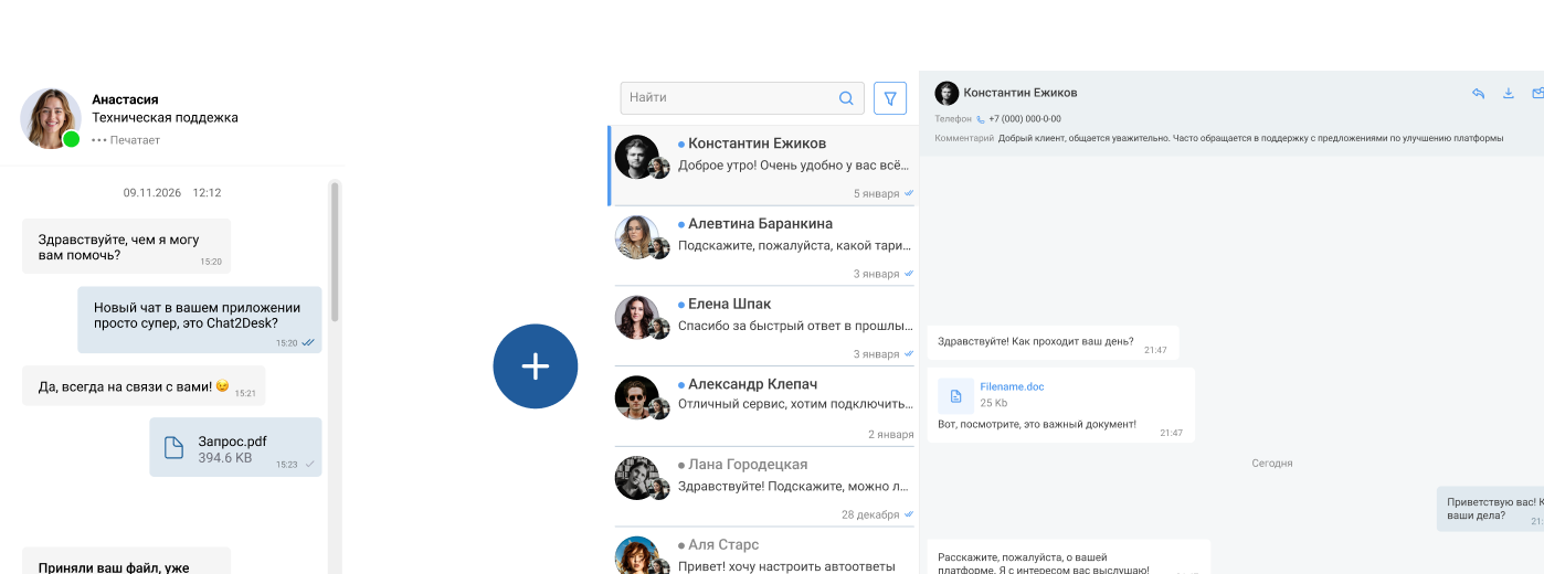 Обрабатывать запросы и общаться с клиентами вы сможете в чат-центре, а хранить информацию из всех диалогов в единой карточке клиента